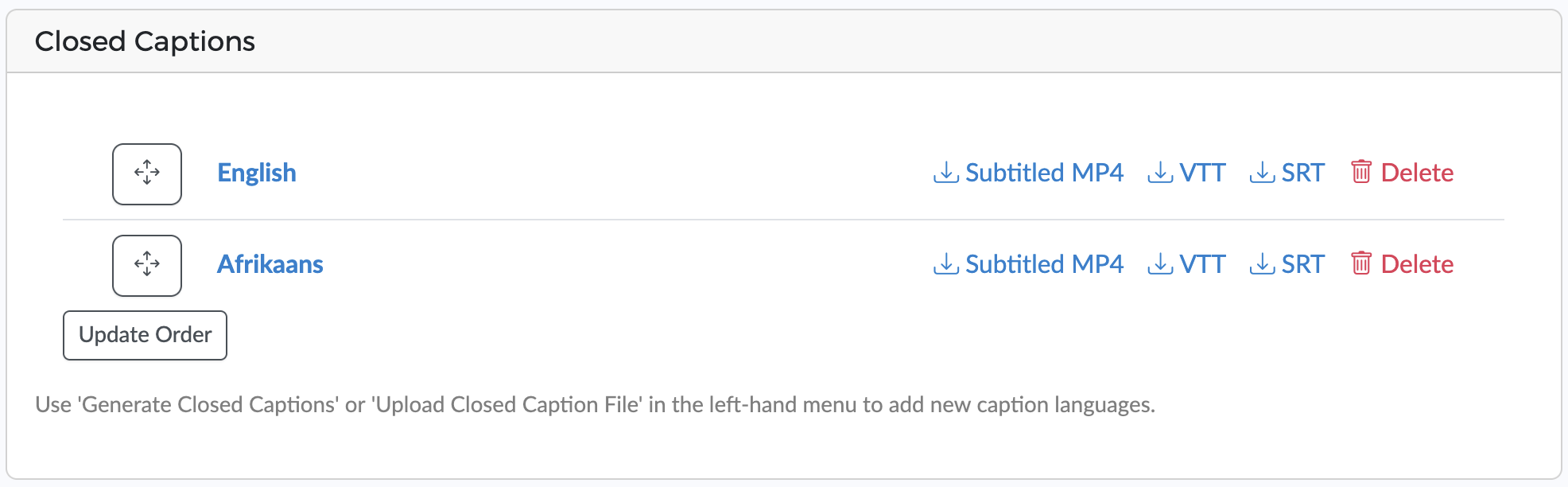 To add closed captions, select the Actions > Add Closed Caption menu on the left of the item page. This will display a popup dialog that lets you upload the WebVTT file for a given language.